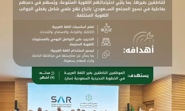 أطلق مجمع الملك سلمان العالمي للغة العربية برنامج “تعليم اللغة العربية للناطقين بغيرها لأغراض تواصلية”، بالتعاون مع الخطوط الحديدية السعودية “سار”، وذلك ضمن جهوده في دعم استخدام اللغة العربية في السياقات المهنية والتخصصية، وتعزيز حضورها في قطاعات العمل المختلفة؛ تحقيقًا لمستهدفات برنامج تنمية القدرات البشرية.