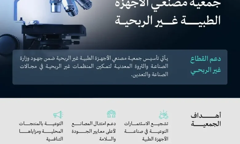 يذكر أن تأسيس جمعية مصنعي الأجهزة الطبية غير الربحية يأتي ضمن جهود وزارة الصناعة والثروة المعدنية؛ لتمكين القطاع غير الربحي، وتعزيز دوره في مجالات الصناعة والتعدين، وزيادة مساهمته وأثره المباشر في إجمالي الناتج المحلي للاقتصاد الوطني، وفقًا لمستهدفات رؤية المملكة 2030.