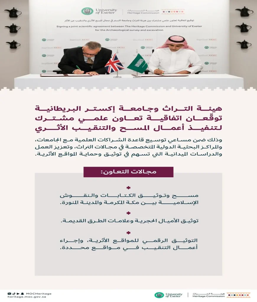 هيئة التراث توقّع اتفاقية تعاون مع جامعة إكستر البريطانية لتنفيذ أعمال المسح والتنقيب الأثري على طريق الحج التاريخي