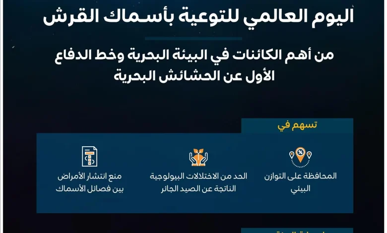 وتجدد وزارة البيئة والمياه والزراعة في هذا اليوم، دعوتها إلى أهمية تعزيز السلوك البيئي المسؤول، ورفع مستوى الوعي المجتمعي بأهمية حماية الكائنات البحرية، وعلى رأسها الأنواع المهددة بالانقراض مثل: أسماك القرش، مسلطةً الضوء على الدور الحيوي الذي تؤديه هذه الكائنات في حفظ توازن النظام البيئي البحري، والحد من الاختلالات البيولوجية التي قد تنتج عن استنزافها أو صيدها الجائر.