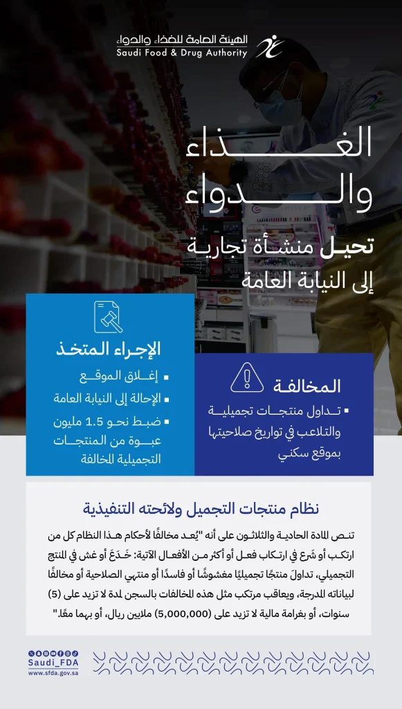أحالت الهيئة العامة للغذاء والدواء منشأة مخالفة إلى النيابة العامة، وذلك لقيامها بتداول منتجات تجميلية والتلاعب بتواريخ صلاحيتها بموقع سكني، في مخالفة صريحة لنظام منتجات التجميل ولائحته التنفيذية.