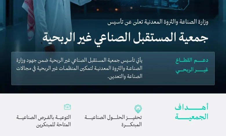أعلنت وزارة الصناعة والثروة المعدنية، تأسيس جمعية المستقبل الصناعي غير الربحية؛ التي تستهدف تعزيز البحث والابتكار، وتمكين المبتكرين والمواهب الواعدة في القطاع الصناعي، بما يدعم استدامة القطاع ويرفع كفاءته، وذلك في إطار جهود الوزارة لتمكين المنظمات غير الربحية في قطاعي الصناعة والتعدين، إيمانًا بدورها في دعم التنمية الاقتصادية والاجتماعية بالمملكة.