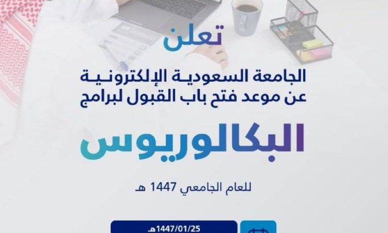 أعلنت الجامعة السعودية الإلكترونية اليوم, عن فتح باب القبول لمرحلة البكالوريوس للعام الجامعي 1447هـ، ويستمر استقبال طلبات التقديم حتى يوم الجمعة 1 أغسطس 2025م عبر بوابة القبول الإلكترونية على موقع الجامعة الرسمي.