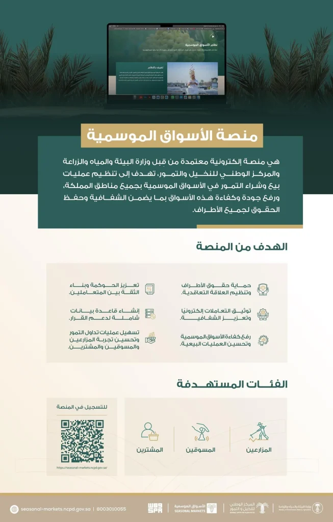 ويُعدُّ التسجيل في المنصة شرطًا أساسيًا لممارسة العمليات البيعية في أسواق التمور الموسمية، وتُقدّم مجموعة من المزايا التي تُسهم في تطوير عملية تداول التمور، من أبرزها: توثيق العقود والاتفاقيات إلكترونيًا، وحماية حقوق كافة الأطراف، وتنظيم عمليات التداول، والإسهام في رفع جودة المنتجات وفق المعايير الفنية والتجارية، إلى جانب توفير بيانات دقيقة حول الكميات والأسعار والأنواع، مما يُعزز من كفاءة اتخاذ القرار.