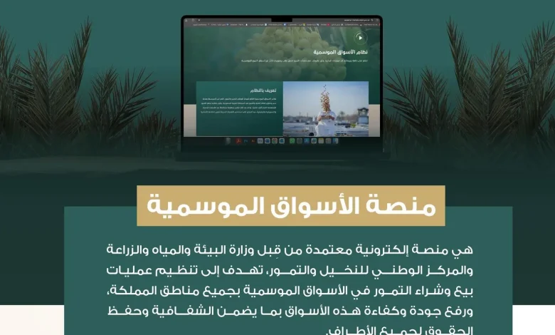 أعلن المركز الوطني للنخيل والتمور بالتعاون مع وزارة البيئة والمياه والزراعة، عن فتح باب التسجيل بمنصة الأسواق الموسمية الإلكترونية التي أُطلقت في العام 2023م، لضبط وتنظيم حركة تداول التمور، ورفع كفاءة العمليات التشغيلية في الأسواق الموسمية.