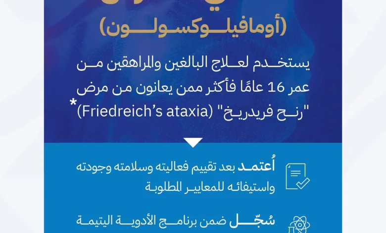 سجّلت الهيئة العامة للغذاء والدواء مستحضر”سكاي كلارس” (أومافيلوكسولون)، الذي عُيِّن مسبقًا بصفته مستحضرًا يتيمًا ضمن برنامج الأدوية اليتيمة، لعلاج البالغين والمراهقين من عمر 16 عامًا فأكثر ممن يعانون من مرض “رنح فريدريخ” (Friedreich’s ataxia)، وهو مرض وراثي نادر يسبب اضطرابًا عصبيًا يؤثر في الحركة، وجودة حياة المريض.