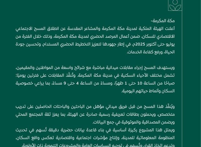 ويستهدف المسح إجراء مقابلات ميدانية مباشرة مع شرائح واسعة من المواطنين والمقيمين، تشمل مختلف الأحياء السكنية في مدينة مكة المكرمة.
