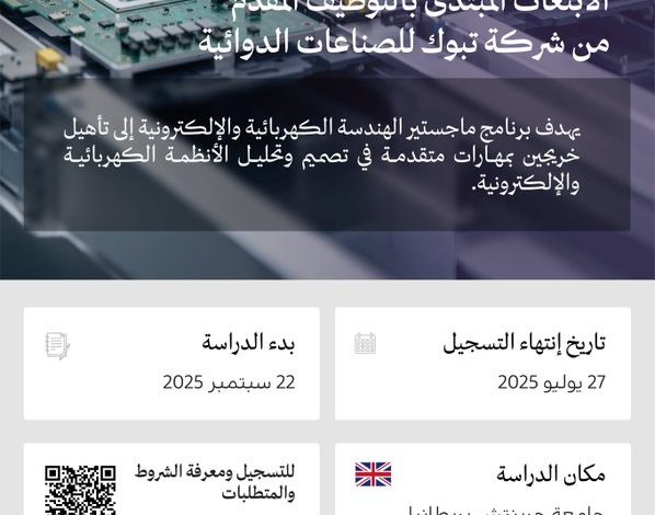 أعلنت وزارة الصناعة والثروة المعدنية، ممثلة في وكالة تنمية القدرات البشرية، بدء التقديم على برنامج الابتعاث المبتدئ بالتوظيف في شركة تبوك للصناعات الدوائية، وذلك لمرحلة الماجستير في الهندسة الكهربائية والإلكترونية، ضمن مسار “واعد” الذي يُعد أحد المسارات الإستراتيجية لبرنامج خادم الحرمين الشريفين للابتعاث، سعيًا من الوزارة لتطوير الكفاءات الوطنية، وإكسابها المهارات العالية للتعامل مع أحدث التقنيات في صناعة الأدوية.
