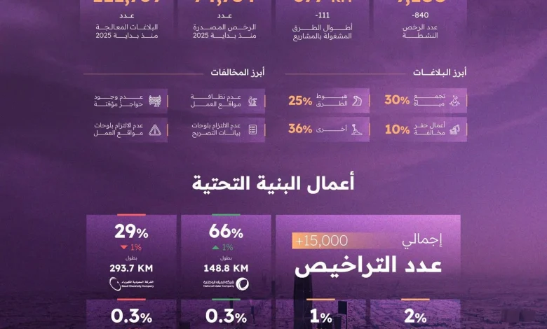 وأشار المركز إلى تسجيل أكثر من 15 ألف رخصة، وأكثر من 8 آلاف بلاغ خلال شهر يونيو، تصدرتها بلاغات تجمع المياه بنسبة 30%، وهبوط الطرق بنسبة 25%، فيما تنوعت المخالفات بين عدم نظافة مواقع العمل، وعدم وجود حواجز مؤقتة، إلى جانب عدم الالتزام بلوحات مواقع العمل.