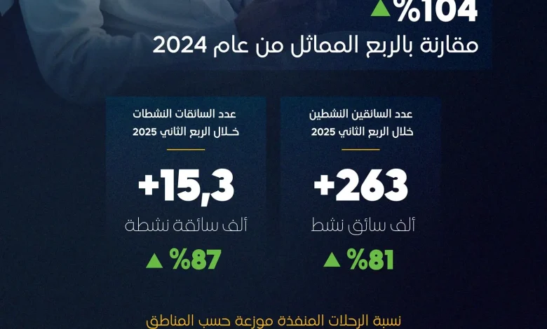 وبحسب المؤشر الذي أصدرته الهيئة، تجاوز عدد الركاب الذين نُقلوا عبر التطبيقات، (263) ألف راكب، مسجلًا نموًا بلغ (81%)، مما يعكس الإقبال الكبير على هذا القطاع في المملكة، فيما بلغت المنصات التشغيلية نحو (15.3) ألف منصة بنسبة نمو وصلت إلى (87%).