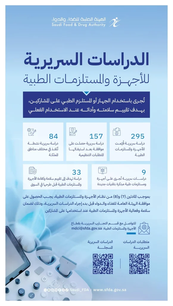 وأوضحت الهيئة أن عدد الدراسات السريرية التي قُيّمت في مجال الأجهزة والمستلزمات الطبية بلغ (295) دراسة، وُوفق على (157) منها بعد استيفاء المتطلبات التنظيمية، فيما يُنفَّذ حاليًّا (84) دراسة سريرية تغطي مختلف مناطق المملكة.