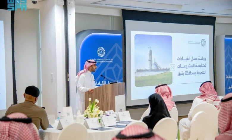 نظّمت هيئة تطوير المنطقة الشرقية اليوم، ورشة عمل القيادات لمتابعة المشروعات التنموية بمحافظة بقيق، بمشاركة 24 جهة تنموية، وذلك في مدينة الملك سلمان للطاقة (سبارك), في محافظة بقيق.