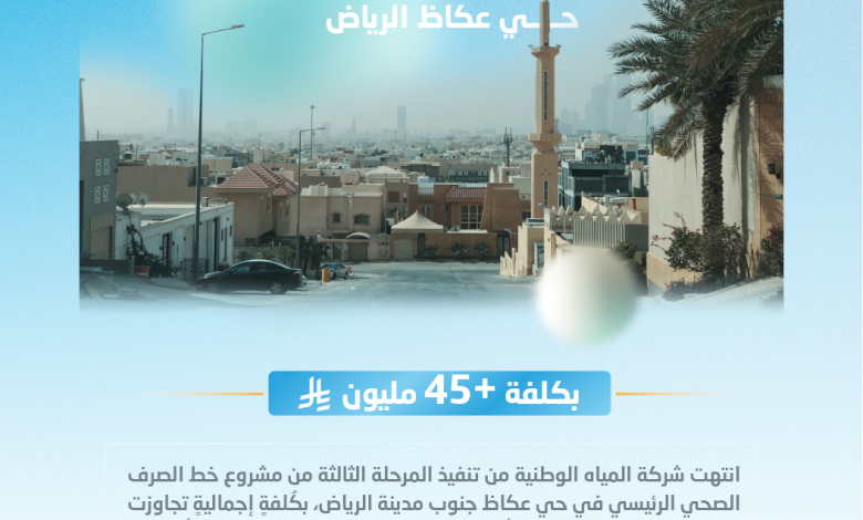 انتهت شركة المياه الوطنية من تنفيذ المرحلة الثالثة من مشروع خط الصرف الصحي الرئيس في حي عكاظ جنوب مدينة الرياض، بكُلفةٍ إجماليةٍ تجاوزت (45) مليون ريال.