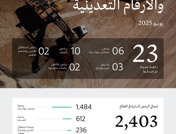 أصدرت وزارة الصناعة والثروة المعدنية (23) رخصة تعدينية جديدة خلال شهر يونيو 2025، في إطار جهودها لتطوير قطاع التعدين بالمملكة، وتعظيم الاستفادة منه في تنويع مصادر الدخل للاقتصاد الوطني.