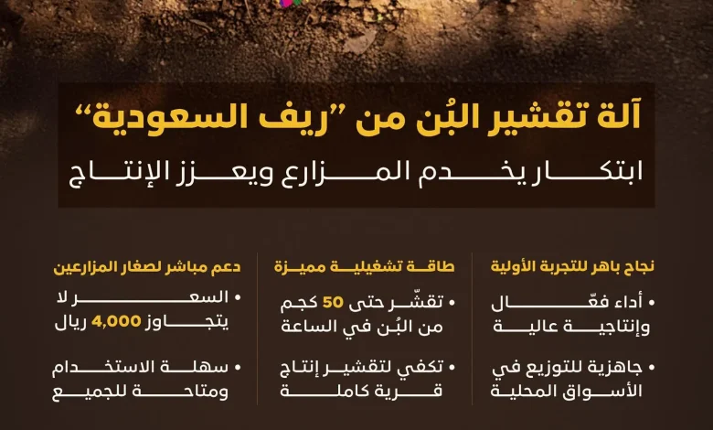 كشف برنامج التنمية الريفية الزراعية المستدامة “ريف السعودية”، عن تحقيق التجربة الأولية لمعدات تقشير البُن الصغيرة، نجاحًا باهرًا، معلنًا البدء في توفيرها بالأسواق المحلية، لتكون في متناول صغار المزارعين؛ دعمًا لتطوير إنتاجهم وتسويق منتجاتهم من البُن.
