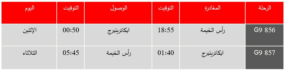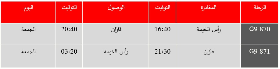 أعلنت “العربية للطيران” أول وأكبر شركة طيران اقتصادي في منطقة الشرق الأوسط وشمال أفريقيا، عن إطلاق رحلات مباشرة جديدة من رأس الخيمة إلى مدينتي ايكاترينبرج وقازان في روسيا، وذلك اعتباراً من أكتوبر القادم، في خطوة تعزز من توسع شبكة وجهات الشركة انطلاقاً من مركز عملياتها في رأس الخيمة.وستنطلق الرحلات الجديدة إلى مطار كولتسوفو الدولي في ايكاترينبرج بمعدل رحلة أسبوعية كل يوم اثنين، ابتداءً من 27 أكتوبر 2025، بينما ستنطلق الرحلات المباشرة إلى مطار قازان الدولي اعتباراً من 31 أكتوبر 2025، بواقع رحلة أسبوعية كل يوم جمعة.جدول الرحلات من وإلى ايكاترينبرغ، اعتباراً من 27 أكتوبر 2025 (المواعيد بالتوقيت المحلي):