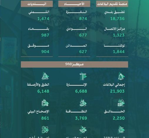 وأوضحت الأمانة أن البلاغات تنوعت بين عدة مجالات خدمية، في البلاغات الخاصة بالإنارة والمرافق الخدمية واللوحات بـ (6,688) بلاغًا، وسُجلت (2,250) بلاغًا يتعلق بالحدائق العامة، و(6,148) بلاغًا في الطرق والشوارع، إضافة إلى (861) بلاغًا للإصحاح البيئي، (195) بلاغًا متعلقة بالسيارات التالفة، و(3,769) بلاغًا للنظافة، و(678) بلاغًا تجمع المياه، و(1,314) بلاغًا لخدمات أخرى.