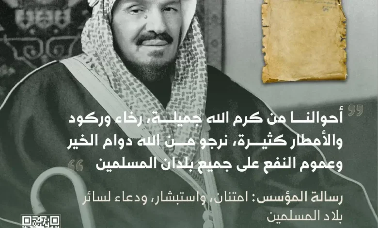 أبرزت دارة الملك عبدالعزيز وثيقة تاريخية مؤرخة في 25 شوال 1344هـ، تتضمن برقية الملك عبدالعزيز بن عبدالرحمن آل سعود -رحمه الله- يُشيد فيها بما تنعم به البلاد من رخاء في الأسعار، وكثرة في الأمطار، مبتهلًا إلى الله أن يَعمَّ خيرها سائر أرجاء بلاد المسلمين، ومؤكدًا أهمية التواصل، والدعاء المتبادل في تلك المرحلة التأسيسية من تاريخ المملكة.