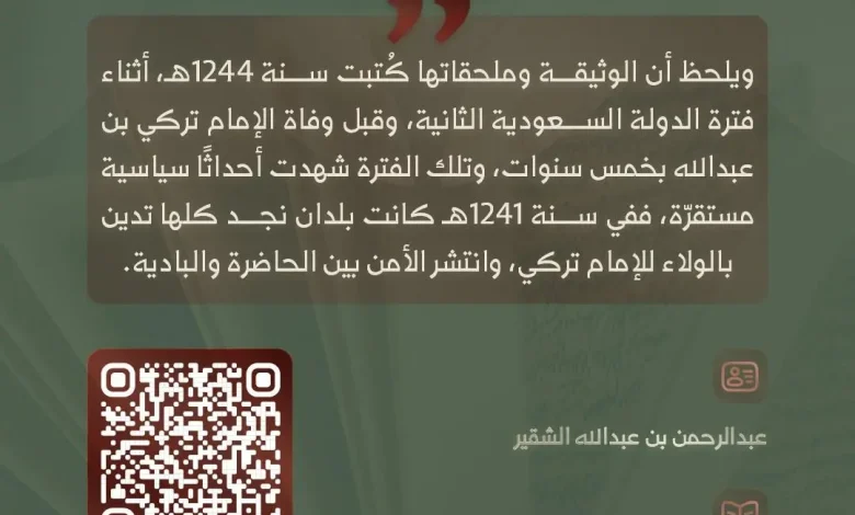 وتكتسب هذه الوثيقة قيمة في أهميتها، كونها صادرة قبل أكثر من 200 عام، في وقت شهد فيه إقليم نجد حالة من التوحد السياسي، والولاء للإمام تركي، وانتشار الأمن بين الحاضرة والبادية، ما يُبرز أبعادًا تنموية واجتماعية تشكّلت تحت مظلة الوقف، أحد أعمدة البناء المجتمعي في تلك المرحلة.
