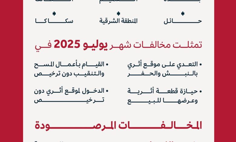 كشفت هيئة التراث عن رصدها (24) حالة تعدٍ على مواقع وقطع أثرية خلال شهر يوليو 2025، ضمن جهودها لحماية الإرث الثقافي الوطني، ومتابعة تنفيذ أنظمة حماية الآثار والتراث العمراني، حيث تنوعت المخالفات بين التعدي على مواقع أثرية بالنبش والتخريب، وممارسة أنشطة تنقيب غير مرخصة، وبيع قطع يشتبه بأهميتها الأثرية عبر المنصات الرقمية.