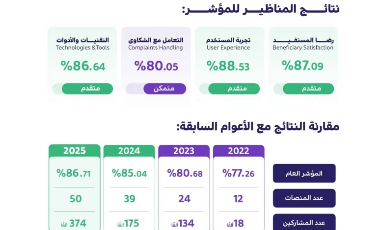 وسجل المؤشر هذا العام نموًا مقارنة بعام (2024)، وارتفاعًا في عدد المستفيدين المشاركين إلى أكثر من (374) ألف مستفيد، كما توسع نطاق التقييم ليشمل (50) منصة مقارنة بـ (39) منصة في العام السابق، مما يجسد جهود الجهات الحكومية، وحرصها المستمر على تطوير تجاربها الرقمية.
