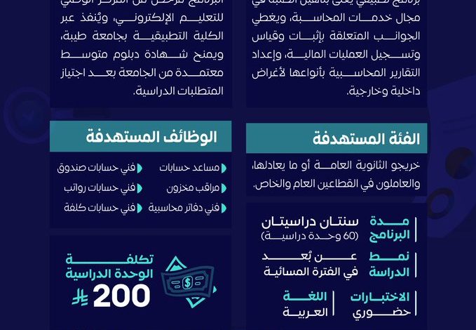 أعلنت جامعة طيبة، ممثلةً في الكلية التطبيقية، عن فتح باب التسجيل في دبلوم المحاسبة المالية بنظام التعليم الإلكتروني (عن بُعد)، ضمن جهودها الرامية إلى تأهيل الكوادر الوطنية بالمهارات المحاسبية المتوافقة مع احتياجات سوق العمل.