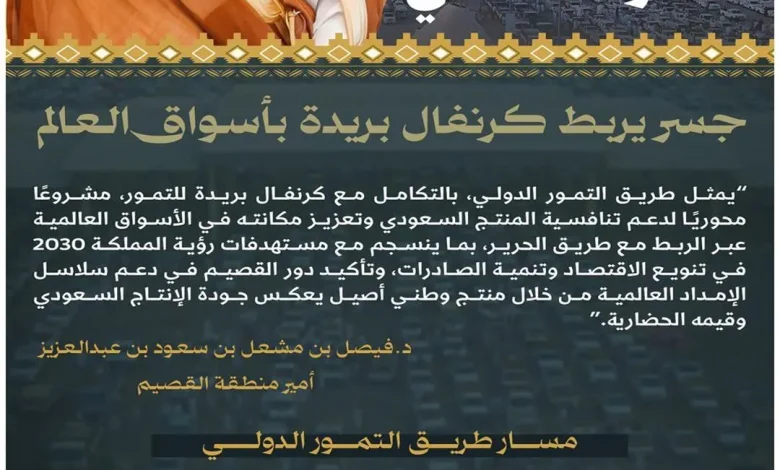أكَّد صاحب السمو الملكي الأمير الدكتور فيصل بن مشعل بن سعود بن عبدالعزيز، أمير منطقة القصيم، رئيس اللجنة العليا لكرنفال بريدة للتمور، أن إطلاق طريق التمور الدولي من قلب الكرنفال، يعد خطوة إستراتيجية ترسّخ مكانة التمور في المملكة على الساحة العالمية، وتجسّد حرص القيادة الرشيدة على دعم القطاع الزراعي، وتعزيز الصادرات الوطنية.