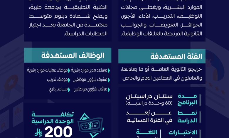 أعلنت جامعة طيبة ممثلةً في الكلية التطبيقية، عن فتح باب التسجيل في دبلوم إدارة الموارد البشرية بنظام التعليم الإلكتروني (عن بُعد)، ضمن جهودها لتأهيل الكوادر الوطنية بما يلبي احتياجات سوق العمل.