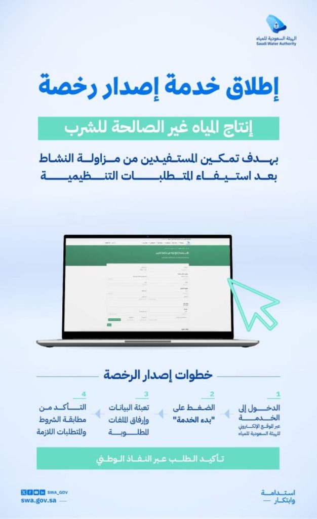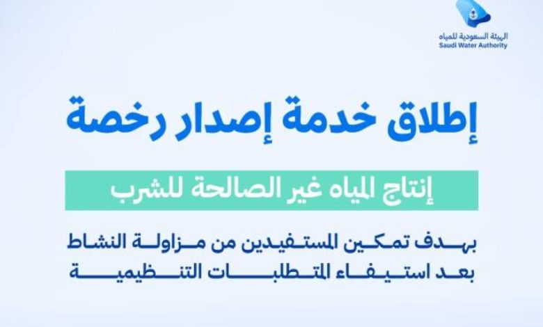 الهيئة السعودية للمياه تُعلن بدء إصدار رخصة إنتاج المياه غير الصالحة للشرب عبر منصتها الإلكترونية