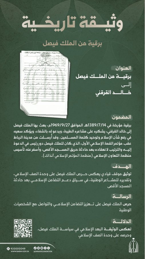وبيّنت الدارة أن الوثيقة تعكس البعد الإسلامي في سياسة الملك فيصل -رحمه الله-، وحرصه على وحدة الصف، ودعم التضامن الإسلامي، وتقديره للمشاعر الوطنية، والتواصل مع الشخصيات المؤثرة بعد حادثة المسجد الأقصى.