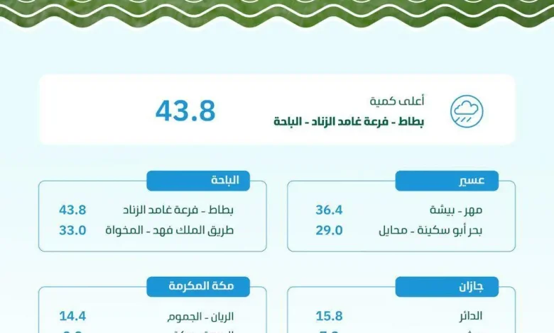 سجّلت منطقة الباحة أعلى معدل لكميات الأمطار بـ(43.8) ملم، في بطاط بفرعة غامد الزناد، وذلك ضمن (6) مناطق بالمملكة، شهدت هطول كميات متفرقة من الأمطار، فيما سجل طريق الملك فهد بالمخواة (33,0) ملم، والمخواة (19,4) ملم، وغامد الزناد بفرعة غامد الزناد (15,0) ملم، وشدا بالمخواة (8,11) ملم.