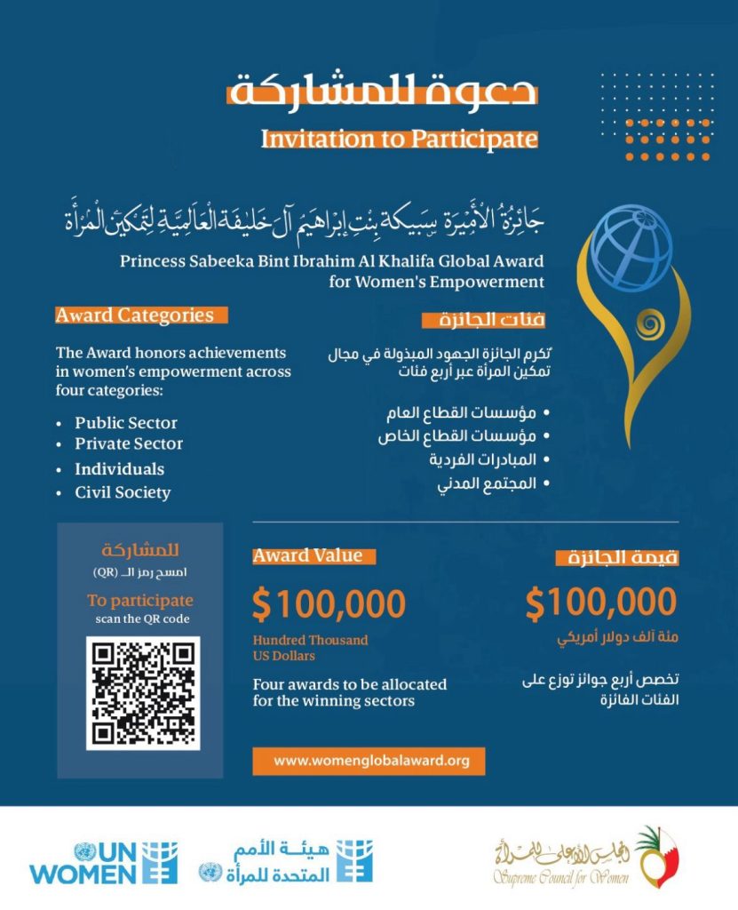أعلنت مملكة البحرين، بالشراكة مع هيئة الأمم المتحدة للمرأة، عن فتح باب التقديم والترشح لجائزة الأميرة سبيكة بنت إبراهيم آل خليفة العالمية لتمكين المرأة في دورتها الثالثة في فئات الجائزة المختلفة للحكومات والشركات والمؤسسات ومنظمات المجتمع المدني والأفراد من ذوي الاختصاص، لدعم الجهود والمساهمات الوطنية التي ترتقي بحياة المرأة وتمكّنها من الإسهام بشكل مُؤثّر في التنمية والنهضة المجتمعية.