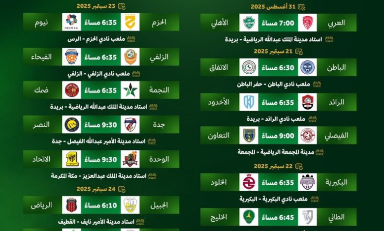 وتتواصل المباريات يوم (21) سبتمبر بإقامة ثلاث مواجهات، إذ يلتقي الباطن مع الاتفاق على ملعب نادي الباطن بحفر الباطن، فيما يستضيف الرائد فريق الأخدود على ملعب نادي الرائد ببريدة، ويواجه الفيصلي نظيره التعاون على ملعب مدينة المجمعة الرياضية في المجمعة.