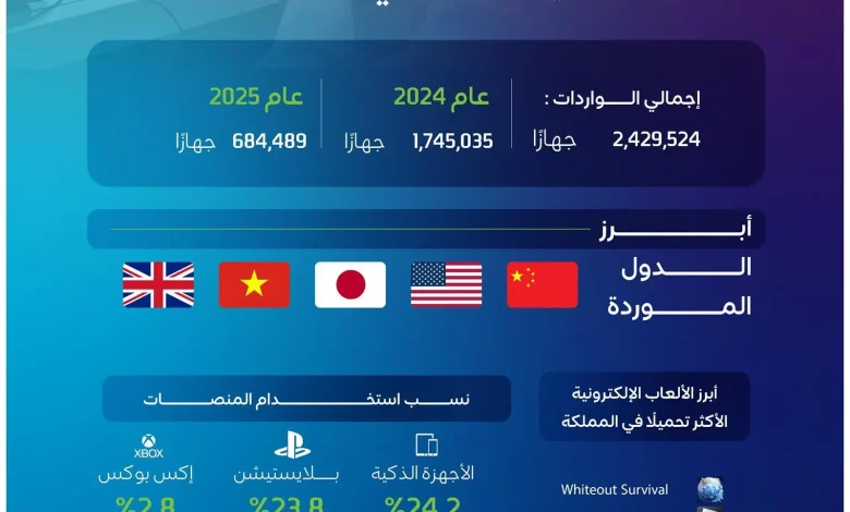 نمو لافت لقطاع الألعاب الإلكترونية في المملكة.. واردات الأجهزة تتجاوز (2.4) مليون جهاز خلال عامي (2024م ـ 2025م)