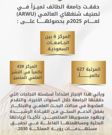 حققت جامعة الطائف إنجازًا أكاديميًا وبحثيًا جديدًا على المستويين المحلي والعالمي، وذلك بعد أن أعلنت نتائج تصنيف شنغهاي العالمي للجامعات (ARWU) للعام 2025م بحصول الجامعة على المرتبة (السادسة) بين الجامعات السعودية والمرتبة (627) عالميًا، إضافة إلى المركز (439) عالميًا في مجال النشر العلمي المتميز.