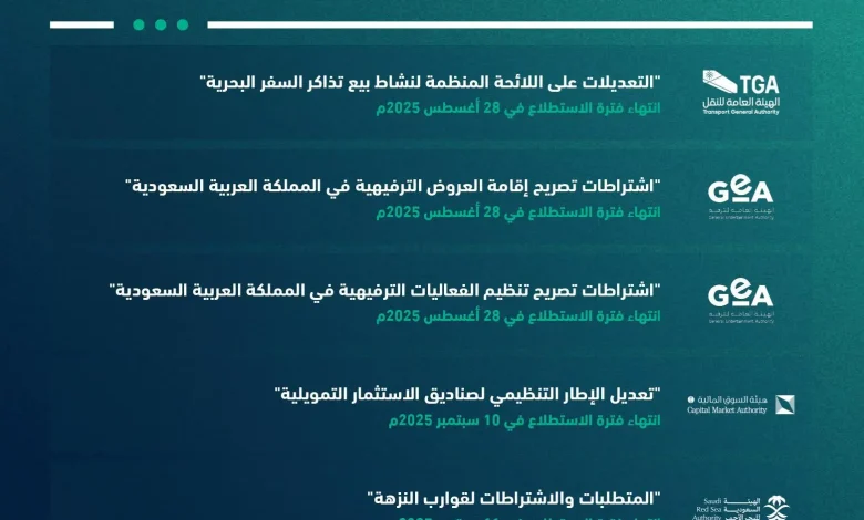 وشهدت المنصة طرح الهيئة العامة للترفيه لمشروع (اشتراطات تصريح إقامة العروض الترفيهية في المملكة العربية السعودية) ومشروع (اشتراطات تصريح تنظيم الفعاليات الترفيهية في المملكة العربية السعودية)؛ وتهدف من خلالهما الهيئة العامة للترفيه إلى تنظيم نشاط الترفيه وتطويره، وتتيح المنصة الاستطلاع على المشروعين إلى يوم 28 من أغسطس الجاري.
