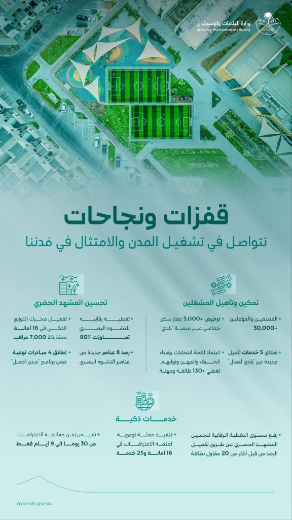 وأكدت وزارة البلديات والإسكان أن هذه المنجزات تأتي ضمن جهودها المستمرة لرفع كفاءة الخدمات البلدية، وتحسين بيئة الاستثمار، وتحقيق مستهدفات رؤية المملكة 2030 في تطوير المدن وتمكين الكفاءات الوطنية وتعزيز جودة الحياة في جميع مناطق المملكة.