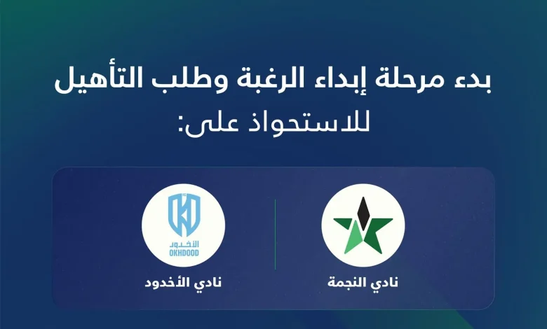 أعلنت وزارة الرياضة، بالتعاون مع المركز الوطني للتخصيص، اليوم، بدء مرحلة إبداء الرغبة وطلب التأهيل للاستحواذ على ناديي النجمة والأخدود، استكمالًا لخطوات العمل المتواصلة، ضمن مشروع الاستثمار والتخصيص للأندية الرياضية، الذي يهدف إلى تعزيز مشاركة القطاع الخاص للاستثمار في القطاع الرياضي، بما يتماشى مع الأهداف الوطنية لرؤية المملكة 2030.