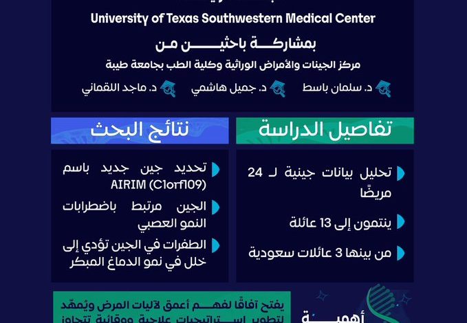 وأظهرت نتائج الدراسة التي أشرف عليها المركز الطبي بجامعة جنوب غرب تكساس، بالولايات المتحدة الأمريكية، وشارك فيها أكاديميون وباحثون من مركز الجينات والأمراض الوراثية، وكلية الطب بجامعة طيبة، أن الطفرات في هذا الجين تؤدي إلى خللٍ في نموّ الدماغ المبكر، بما يفتح آفاقًا لفهم أعمق للمرض، وتطوير إستراتيجياتٍ علاجية ووقائية.