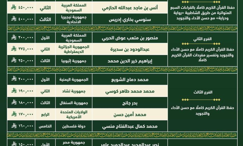 اعتمد معالي وزير الشؤون الإسلامية والدعوة والإرشاد الشيخ الدكتور عبداللطيف بن عبدالعزيز آل الشيخ، نتائج وأسماء الفائزين في مسابقة الملك عبدالعزيز الدولية لحفظ القرآن الكريم وتلاوته وتفسيره في دورتها الخامسة والأربعين، التي عُقدت في رحاب المسجد الحرام خلال الفترة 15 – 26 صفر لعام 1447هـ, بمشاركة (179) متسابقًا من (128) دولة من مختلف دول العالم تنافسوا على فروع المسابقة الـ(5), ويبلغ إجمالي الجوائز (4.000.000) ريال.