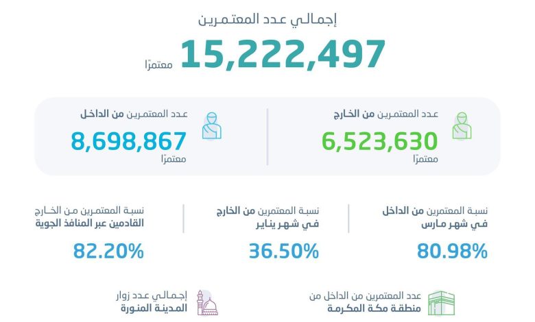 وأظهرت نتائج النشرة أن عدد المعتمرين القادمين من الخارج بلغ 6,523,630 معتمرًا بزيادة 10.7% مقارنةً بالربع الأول من عام 2024، حيث قدم معظمهم عبر المنافذ الجوية بنسبة 82.2%، في حين بلغ عدد معتمري الداخل 8,698,867 معتمرًا، مثّل غير السعوديين منهم ما نسبته 58%.
