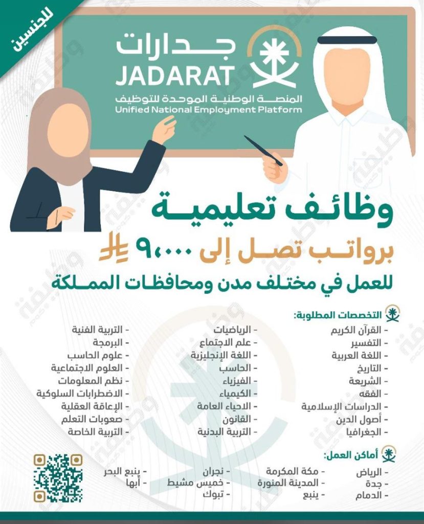 أعلنت منصة جدارات (المنصة الوطنية الموحدة للتوظيف) عن توفر أكثر من 199 وظيفة تعليمية للرجال والنساء، في عدد من مناطق المملكة، برواتب تصل إلى 9,000 ريال شهريًا، وذلك ضمن جهودها في دعم الكوادر الوطنية وتأهيلهم للانخراط في سوق العمل التعليمي.