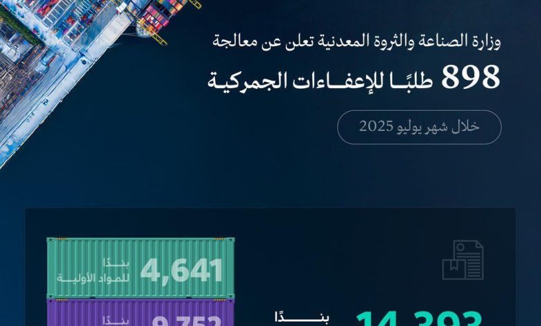 وزارة الصناعة والثروة المعدنية تعالج 898 طلبًا للإعفاء الجمركي خلال شهر يوليو 2025م