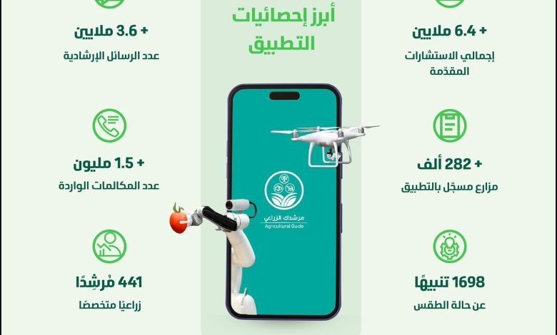 وأشارت إلى أن تطبيق “مرشدك الزراعي”، حقق العديد من المنجزات والجوائز منذ إطلاقه، وتميز بصفته واحدًا من أفضل التطبيقات الرقمية الخدمية في المنطقة؛ حيث حصل التطبيق على عدة جوائز، أبرزها، درع الحكومة الرقمية العربية كأفضل تطبيقٍ عربي، وجائزة اتحاد الأصدقاء للأمم المتحدة لتنمية الاستدامة، إضافةً إلى شهادة الآيزو للجودة، كما حقق التطبيق أرقامًا قياسية، من أبرزها تقديم أكثر من (6.4) ملايين استشارة فنية للمزارعين، كما تجاوز عدد المزارعين المسجلين في التطبيق (282) ألف مزارع، إلى جانب (441) مرشدًا متخصصًا، مبينةً أن التطبيق وردت إليه خلال الفترة المذكورة، أكثر من (1.5) مليون مكالمة صوتية، فيما تجاوز إجمالي عدد الرسائل النصية الإرشادية (3.6) ملايين رسالة، فيما بلغ عدد الاستشارات المقدمة لقسم اسأل عن نبات وآفة، أكثر من مليون استشارة، كما قدّم التطبيق للمزارعين نحو (1700) تنبيه عن حالة الطقس بحسب ما يعلن من المركز الوطني للأرصاد، و(687) حلقة بث مباشر إرشادية، إضافةً إلى (7945) خبرًا ومحتوىً إرشاديًا منشورًا، و (337) تحليلًا للتربة والمياه.