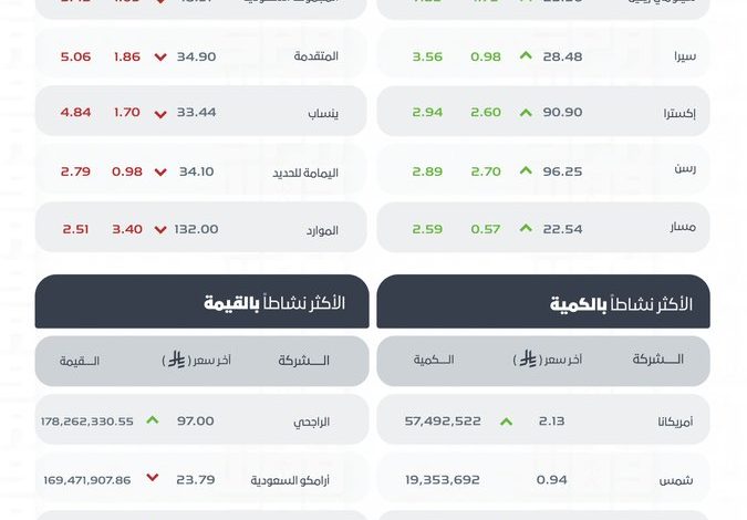 وكانت أسهم شركات أمريكانا، وشمس، ومجموعة فتيحي، وكيان السعودية، وباتك هي الأكثر نشاطًا بالكمية, وكانت أسهم شركات الراجحي، وأرامكو السعودية، وسينومي ريتيل، وسابك، وstc، هي الأكثر نشاطًا في القيمة.