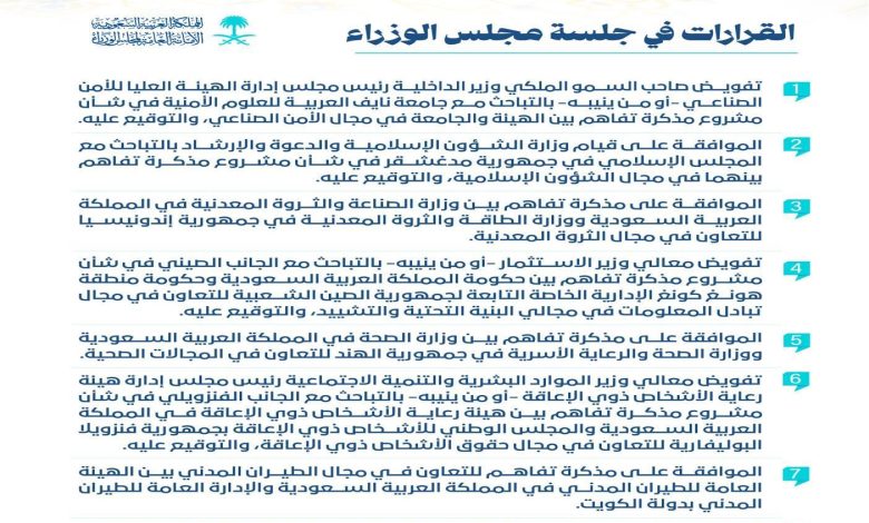 واطّلع مجلس الوزراء على الموضوعات المدرجة على جدول أعماله، من بينها موضوعات اشترك مجلس الشورى في دراستها، كما اطّلع على ما انـتهى إليه كل من مجلسي الشؤون السياسية والأمنية، والشؤون الاقتصادية والتنمية، واللجنة العامة لمجلس الوزراء، وهيئة الخبراء بمجلس الوزراء في شأنها، وقد انتهى المجلس إلى ما يلي: