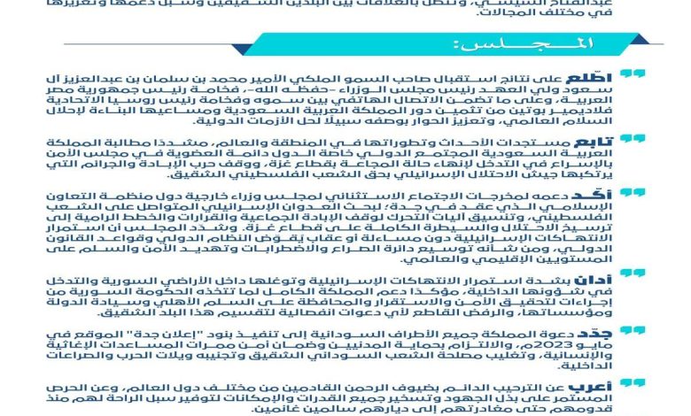 وجدّد المجلس دعوة المملكة جميع الأطراف السودانية إلى تنفيذ بنود “إعلان جدة” الموقع في مايو 2023م، والالتزام بحماية المدنيين وضمان أمن ممرات المساعدات الإغاثية والإنسانية، وتغليب مصلحة الشعب السوداني الشقيق وتجنيبه ويلات الحرب والصراعات الداخلية.