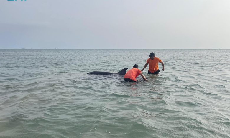 حرس الحدود بمنطقة مكة المكرمة يعيد دلفينًا للبحر بعد أن جرفته الأمواج إلى الشاطئ