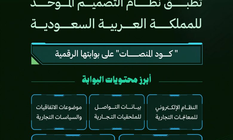ويعد “كود المنصات الموحد” المرجع الوطني الشامل لتوحيد تصميم واجهات المنصات الحكومية في المملكة، إذ يهدف إلى تحسين تجربة المستخدم من خلال توحيد الهوية البصرية للمنصات الحكومية الرقمية، بتصميم يتوافق مع أفضل الممارسات والمؤشرات العالمية والمحلية، بما يضمن تجربة سلسة وموحدة للمستفيدين من الخدمات الرقمية الحكومية في المملكة.