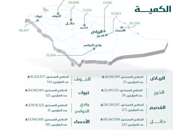 وبلغ إجمالي ما تم إيداعه في حسابات المزارعين البنكية لهذه الدفعة (532,004,950) ريالًا، لصافي كمية مستلمة (296,937) طنًا، لعدد (995) مزارعًا، ليبلغ إجمالي ما تم صرفه هذا الموسم (989,577,445) ريالًا، وذلك لكمية (555,390) طنًا، لـ (2,000) مزارع.